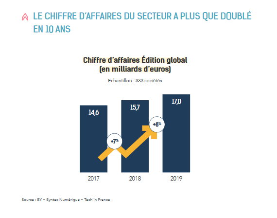 - 10 ans de croissance ininterrompue pour un secteur à forte capacité de résilience : le chiffre d’affaires des 326 éditeurs inclus dans le panorama en 2019 atteint 17 milliards d’euros. Ce chiffre d’affaires a plus que doublé en l’espace de 10 ans : en 2010, les 297 éditeurs qui avaient participé à l’étude avaient réalisé 7,7 milliards d’euros de chiffre d’affaires édition. Malgré la crise, 75% des éditeurs de logiciels prévoient une croissance ou un maintien de leur chiffre d’affaires en 2020, et plus de la moitié envisage une croissance de plus de 5% de l’activité.
